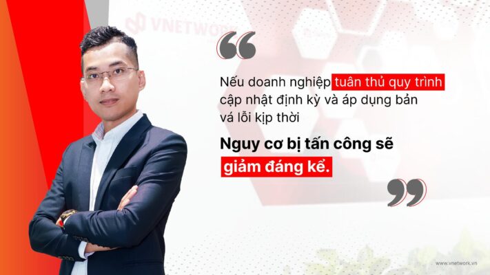 Ông Nguyễn Văn Tạo – Giám đốc VNETWORK – nhận định: “Nếu doanh nghiệp tuân thủ quy trình cập nhật định kỳ và áp dụng bản vá kịp thời, nguy cơ tấn công sẽ giảm đáng kể. Hệ thống cần được giám sát 24/7 bởi các chuyên gia giàu kinh nghiệm để phát hiện sớm và phản ứng nhanh khi có dấu hiệu bất thường”.