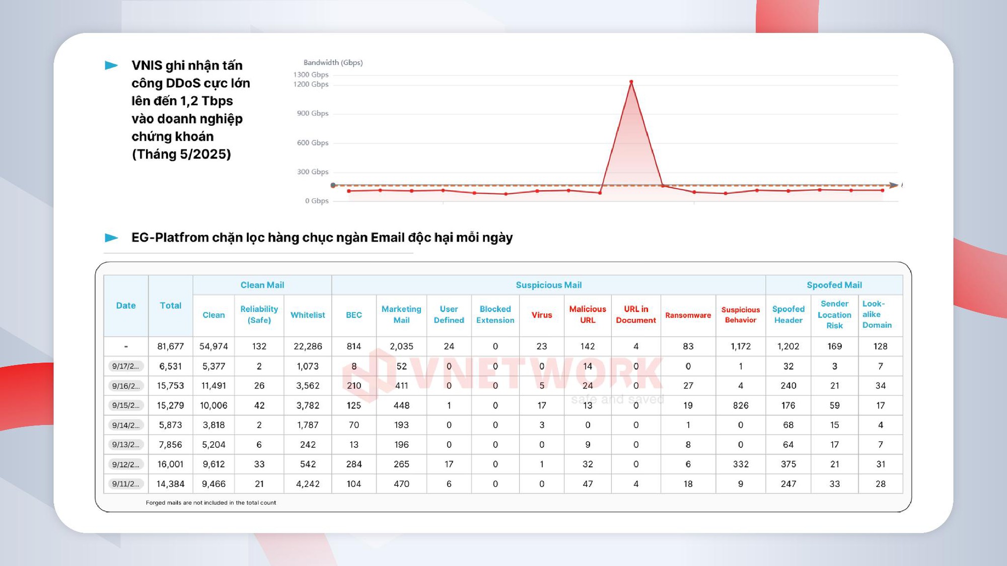 Là Trung tâm Ứng cứu An ninh mạng toàn diện, VNETWORK cung cấp giải pháp bảo vệ doanh nghiệp trước rủi ro ngày càng gia tăng. Nổi bật trong đó là VNIS – hệ thống giám sát và phòng thủ thông minh, có khả năng phát hiện sớm tấn công DDoS, chèn mã độc hay malware; cùng với đội ngũ SOC trực 24/7, giám sát liên tục và phản ứng kịp thời khi có sự cố. Ngoài ra, giải pháp CDN kết hợp bảo vệ dữ liệu giúp tối ưu tốc độ website và giảm thiểu gián đoạn khi bị tấn công.